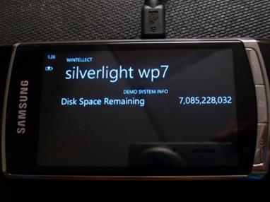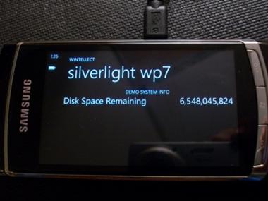 To determine the total amount of space remaining on disk, the IsolatedStorageFile instance offers an AvailableFreeSpace property. With “traditional Silverlight”, this returns the amount of space remaining in the current quota. Since Silverlight for Windows Phone does not have quotas, the AvailableFreeSpace property will return the amount of storage space remaining on the device.