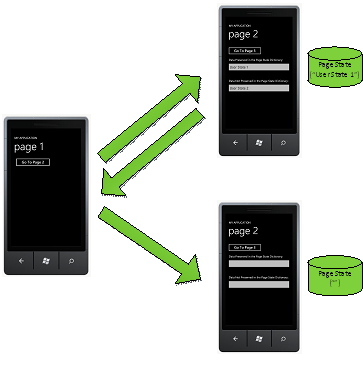 - The user presses the “Go to Page 2” button again. In the page’s OnNavigatedTo method, the Application State Dictionary is interrogated to see if it has a value, and if so, the value is applied to the first textbox